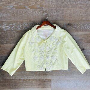 Cropped 60’s style blazer with floral appliqué. Quarter length sleeves. Linen, cotton. Dry clean only.