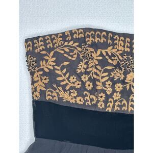 Beautiful black strapless embroidered strapless top by Anthropologie brand designer Tracy Reese- with black beaded detailing! 100% silk Fully lined in silk Tiered layers Made In India Beautiful condition! Velvet sash with bow to the side around waist embroidered silk chiffon Beautiful gold embroidery throughout with beading on embroidery. Perfect for that formal event with either black pants or a skirt. Or could be dressed down with a pair of jeans for a more casual look.