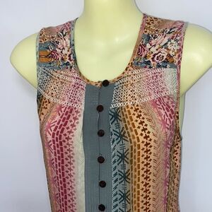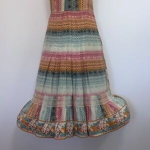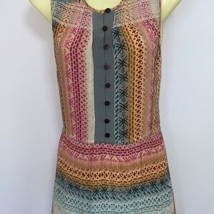 FOR PLENTY BY TRACY REESE, HERE IS A GORGEOUS MAXI DRESS.IT IS 100% SILK AND DONE IN AN ABSTRACT PRINT OF ROSES AT THE SHOULDERS,AND PINK, GREEN, GOLD AND BLUE THROUGHOUT. THIS BEAUTY FEATURES A SCOOP NECK AND AN 8 BUTTON FRONT BODICE. THE DROP WAIST FALLS TO MAXI LENGTH IN A LIGHTLY PLEATED FLOWING SKIRT.THIS DRESS IS NOT SEE THROUGH.EXCELLENT CONDITION~SIZE 2, IT DOE HAVE STRETCH, BUT PLEASE NOTE THE MEASUREMENTS