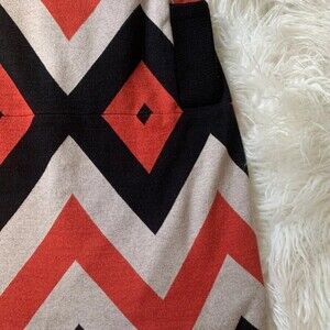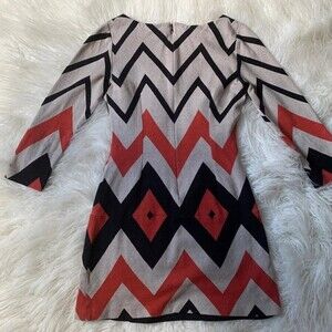 Excellent condition Plenty by Tracy Reese Constructivist Jacquard Placement Shift Dress in Gardenia & Pimento & Black dress size small. Drop waist chevron print, 60’s vibe.