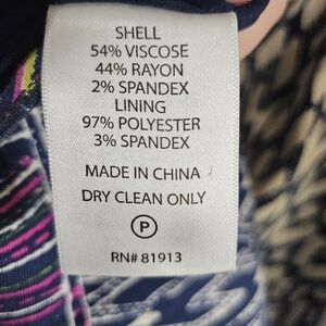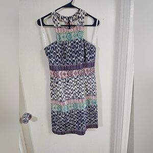 This elegant sheath dress by Plenty by Tracy Reese features a striking halter neckline and a sleeveless design, perfect for a wedding guest or cocktail occasion. The dress showcases a captivating geometric pattern in blue and pink, with a fitted silhouette that flatters the figure. Crafted from lightweight fabric, it offers comfort and style for a night out.
