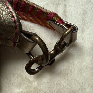 Chic bronze hobo with drawstring closure. Features dual front pockets and stylish strap.