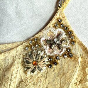 The silk lining camisole has a small hole on the back top as shown. I put a couple of stitches in it but it could be more skillfully addressed and is not discerned under the dress. I inherited this along with a package of replacement beads, sew on rhinestones and button. Made in India and very well constructed.