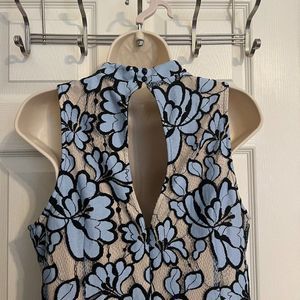 Elegant sleeveless dress with floral lace overlay. Features a high neckline and keyhole back. Perfect for special occasions.