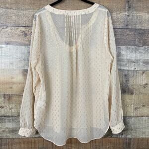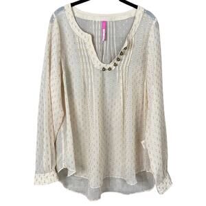 Plenty by Tracy Reese Semi Sheer Blouse. Size tag missing. See measurements in the pictures. Long sleeve. Cream color with metallic gold embroidery. Beading at the neckline. Pintuck details. Excellent condition.