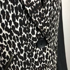 Plenty by Tracy Reese black and white animal print jacket with black leather sleeves. Collared with V neckline and single button front closure. Double zip front pockets. Black leather sleeves that zip off at the shoulder. Back vent hemline. Unlined. Size 4. Excellent pre-owned condition. Linen viscose blend. Sleeves 100% lamb leather.