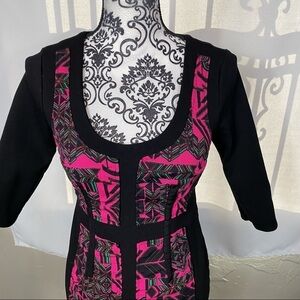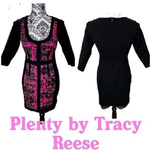 Plenty by Tracy Reese. Black and hot pink contrast ponte dress. 1/2 sleeve. Stretchy material. Back zipper closure. Knee length. Shell: 54% viscose 44% rayon 2% spandex. Lining 97% polyester 3% spandex. Size 4