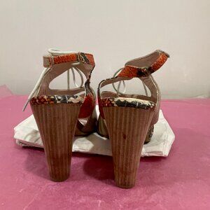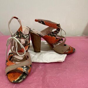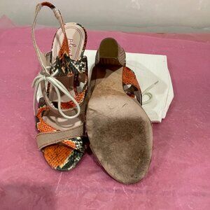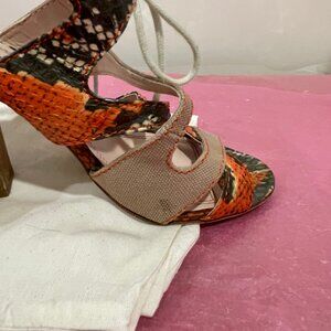 Funky High heeled sling back sandals with shoelace ties Tan linen and orange and grey snakeskin print leather uppers.Soles and lining are also leather. Shoes have 4 inch wooden block heels. Lightly worn with small light dirt stain on inside of left shoe near the front (see photo). Shoes have a sneaker like lacing in front adding to their uniqueness.