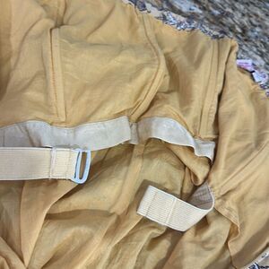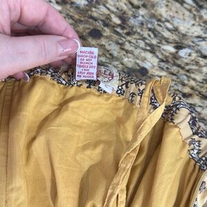 This is a strapless mini dress featuring a fitted corset-style bodice for a structured, flattering shape. It has a flared A-line skirt that creates a playful silhouette. The fabric showcases an intricate damask-inspired pattern in brown against a mustard yellow background, giving it a bold yet elegant look