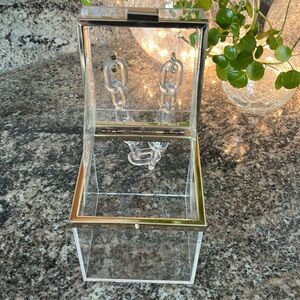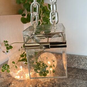 Gold-tone hardware. Clear plastic with clear chain link handle. Perfect for stadium use! 🌟 5.1” x 4” x 4”. Approximately. Handle drop 4.5”. Preloved with scratches.
