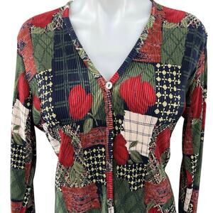 Plisse Red Corduroy Floral Patchwork Long Sleeve Button Up Blouse Top Size L