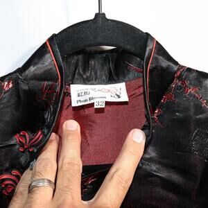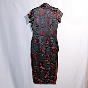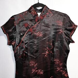 Plum Blossom 100% Puac Silk Chinese Mandarin Style Dress Black Red Satin 32 XS