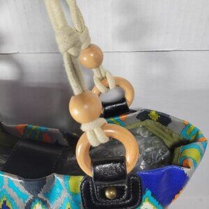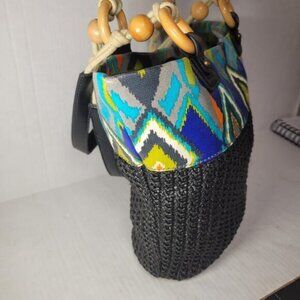 Plum Brand Multicolored Fabric Southwestern Wood Accent Woven Shoulder Handbag