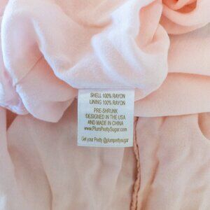 Romantic and feminine, this Plum Pretty Sugar wrap maxi dress in a soft blush pink features a botanical floral print with cascading ruffle trim at the neckline. Made from 100% rayon for a light, airy drape and designed in the USA, this dress is perfect for weddings, garden parties, or resort vacations. Wrap style allows for adjustable fit. Note: small flaw on wrap tie seam as shown in photo.