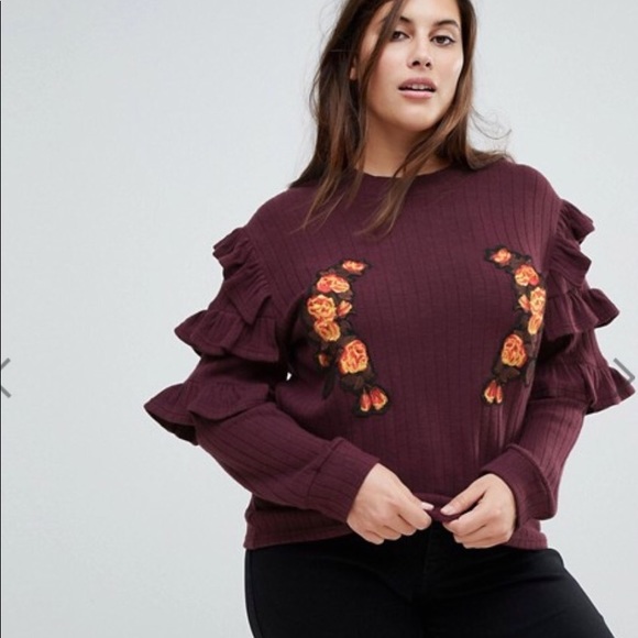 Plum sweater with ruffles on the sleeves and floral patches on the chest. Worn once and in perfect condition
