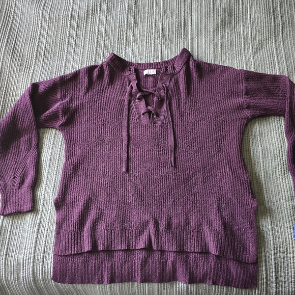 This long sleeve plum color sweater has a nice lace-up detail on the front. It is a nice and warm knit material, but not itchy. the sleeves have stitching details along the arms. There are slits on the hem on the sides so it lays nicely and down not get bunched up. Very flattering.