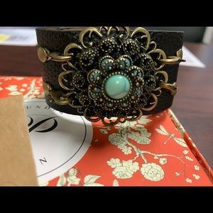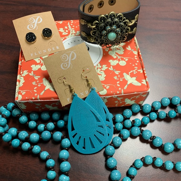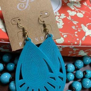 Missy cuff with Sharon pendent, Mabel black leather and teal necklace, joquelle teal wood laser cut earrings-super light weight, black druzy studs. This set is beautiful!!