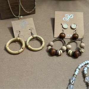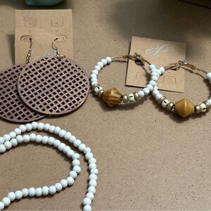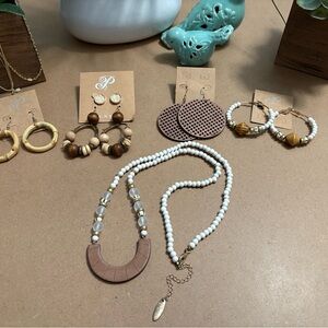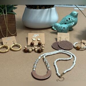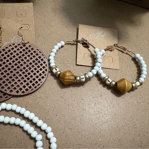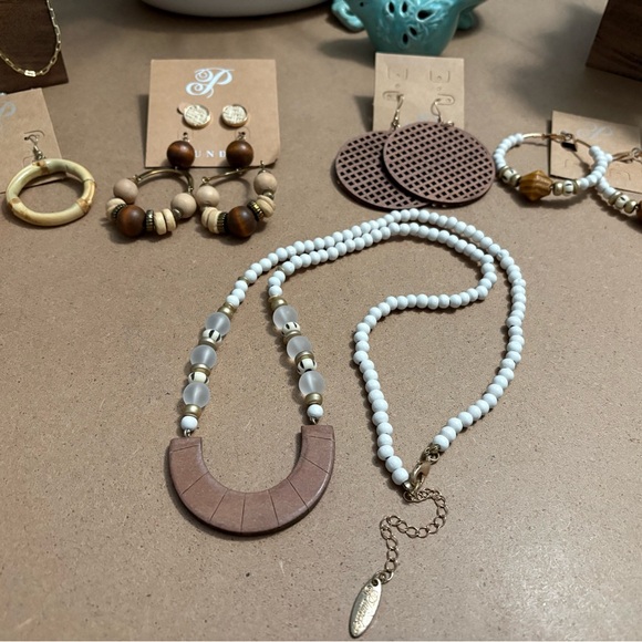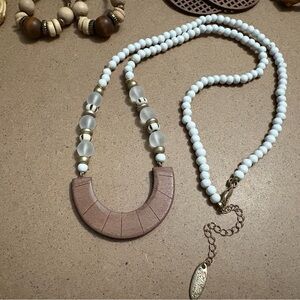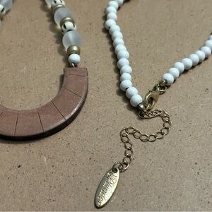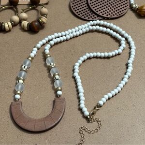 eclectic and vintage-inspired jewelry. The earthy tones and natural looking materials are very signature to bohemian aesthetic. Brigetta Necklace: white petite beaded necklace featuring the brown wood-look crescent pendant.