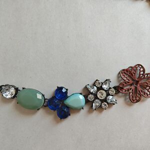 Necklace features a unique asymmetrical design with large faceted clear crystals, blue and green glass stones, a pink filigree flower accent, and a flower motif with briolette rhinestones.
