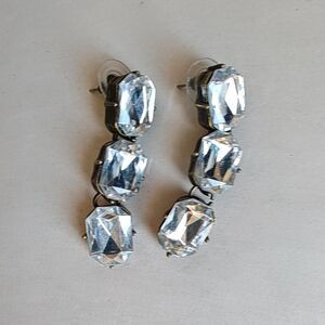 Matching dangle earrings each feature three large clear faceted stones in antiqued brass-tone settings with post and plastic disc backs.