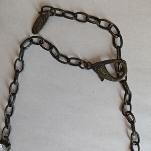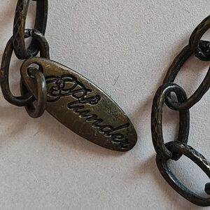 Chunky antiqued brass-tone chain with large lobster clasp and signature "Plunder" brand logo tag at closure.