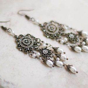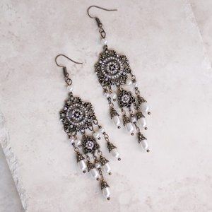 Antique Gold & Faux Pearl Chandelier Earrings 4” Drop