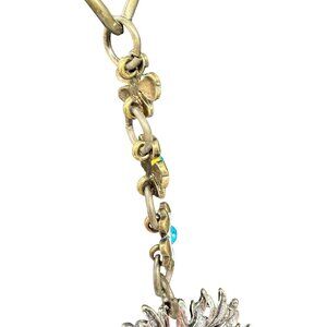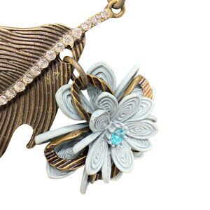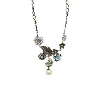 This striking Plunder Designs necklace showcases an array of floral and pearl charms, accented with intricate embellishments. It features a mix of colors and textures, making it a versatile addition to various outfits. The statement piece exudes elegance and creativity, offering a unique twist to traditional jewelry.