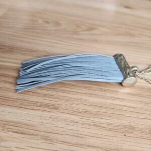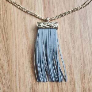 Chic Plunder Design multi strand tassel necklace featuring layered gold-tone cable chains and a long light gray faux leather tassel pendant. Statement boho style with hammered rectangular cap and branded Plunder hang tag. Necklace measures approximately 19" long; tassel adds extra dramatic drop for a long pendant look. Lobster clasp with extender for adjustable fit. Perfect accent for casual outfits, festival looks, or layering with other necklaces. Preowned Plunder fashion jewelry, ready to wear.
