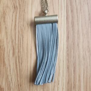 Plunder necklace, tassel pendant, boho statement, multi strand chain, gold tone jewelry, gray faux leather, layered necklace, long pendant style, festival fashion, womens accessories