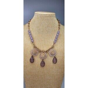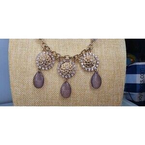 Beautiful pre-owned and in very good condition. Three cream colored flowers with rhinestone accents and grey acrylic face cut beads hanging from each flower. Gold Tone chain with lobster clasp and extension chain.
