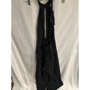The Anthropologie Black Plunging Jumpsuit in size XS is a stylish one-piece outfit perfect for both parties and casual occasions. The halter neckline and backless design give it a chic and sexy look, while the wide-leg fit adds a trendy and fashionable touch. Made from machine washable materials, this easy-care jumpsuit is ideal for the summer and spring seasons, making it a versatile and comfortable choice for any woman's wardrobe.