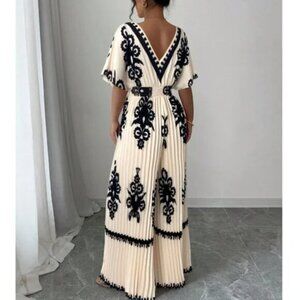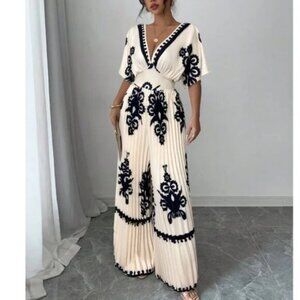 Plunging Neck Kimono Sleeve Pleated Wide Leg Jumpsuit