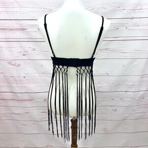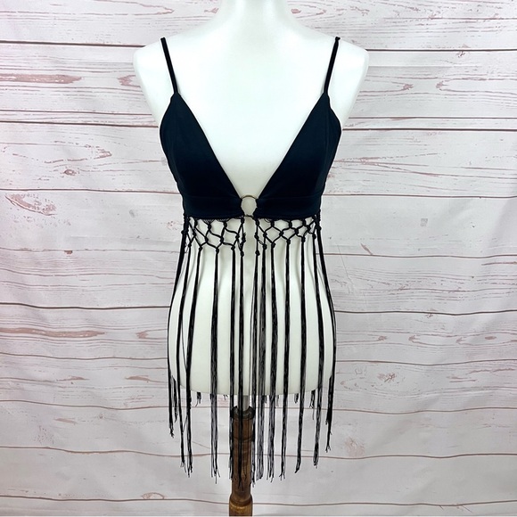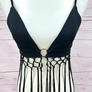 Plunging Neckline Boho Fringe Triangle Bikini Bralette Top. Cotton blend, with long tassel fringe. Size 4 and can fit a 34-36 bustline. Has a traditional bra back clasp.