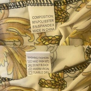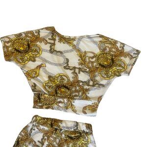 This stunning two-piece outfit features a cropped top and pants with a beautiful white and gold baroque print. The set is perfect for any occasion, whether it's a party or a casual day out. The outfit is made of a comfortable and stretchy knit fabric with an elastic waist for added comfort. The short-sleeved top has a plunging neckline and a slim fit, with straight leg pants. The set is made of polyester and spandex materials and is hand wash is recommended. This outfit is perfect for your vacation trip, summer weather, fall, and spring seasons. Add this elegant and stylish set to your wardrobe today! No size tags on outfit - see last 2 pics for measurements.