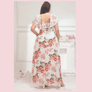 Vestido de fondo blanco, estampado en flores rosadas. Sin espalda con capa escalonada, cuello V, manga mariposa.
