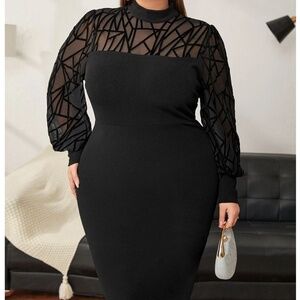 Plus Black Mock Neck Semi Sheer Long Sleeve Fitted Dress