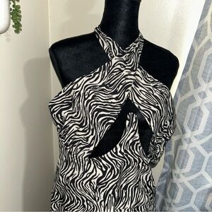 PrettyLittleThing black zebra print material with a cross front design and a bodycon fit.