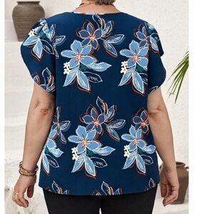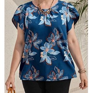 Plus Blue Floral print Ruffle Short Sleeve Blouse