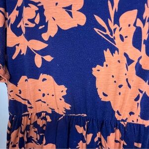 This maxi dress features a stunning floral pattern with a deep navy blue base adorned with vibrant orange blooms. It is designed with short dolman sleeves and a comfortable crew neck, perfect for casual outings. The relaxed sheath silhouette offers both style and ease of movement.