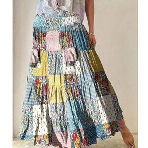 Plus Boho Floral Print Gingham Patchwork Stretchy Waist Maxi Skirt