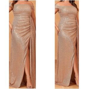 Plus Champagne Sequin Off Shoulder Ruched Formal Party Wedding Dress