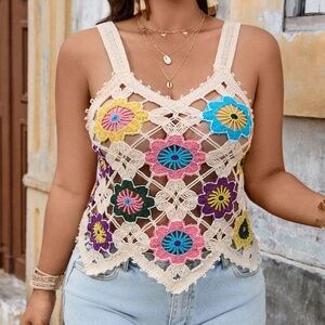 Plus Colorful Floral Crochet Semi Sheer Tank top