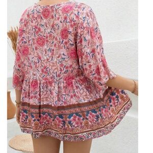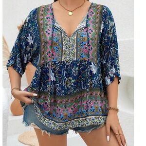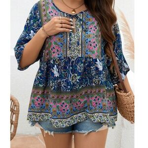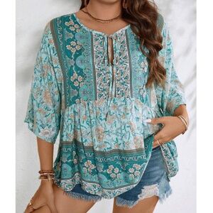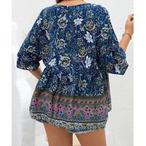 Plus Colorful Floral Print Neck Tie 3/4 Sleeve Blouse