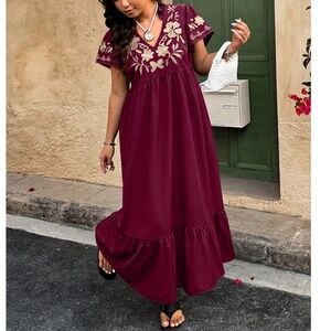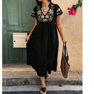 Plus Floral Embroidered Frill Neck Short Sleeve Ruffle Hem Dress