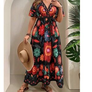 Plus Floral Print Belted Butterfly Sleeve Maxi Dress