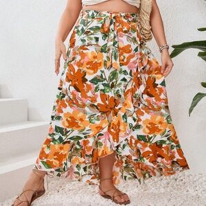 Plus Floral Print Ruffle Hem Wrap Maxi Skirt