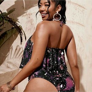 Plus Galaxy Print Flounce Bikini Swimsuit