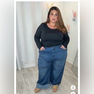 Black and white shapes on this v-neck dolman sleeve dress. Shirred waist. Split hem and lining. No stretch but lots of room. From BloomChic. Size 18/20. 98% Polyester 2% Spandex. Machine wash. Only worn to model. Has tag from smoke free home.