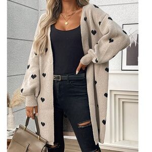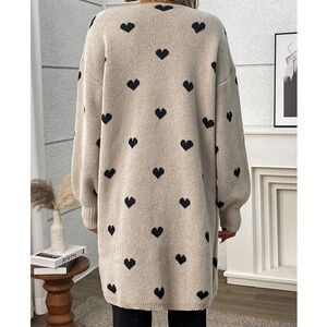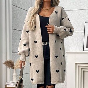 Plus Heart Print Knit Open Front Loose Fit Cardigan