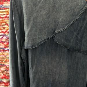 Nice open swing jacket for coverup. No zipper. Open with ruffles. Long sleeves. Pockets. Back had decorative design. Dry clean only. Denim look. Material is very light.